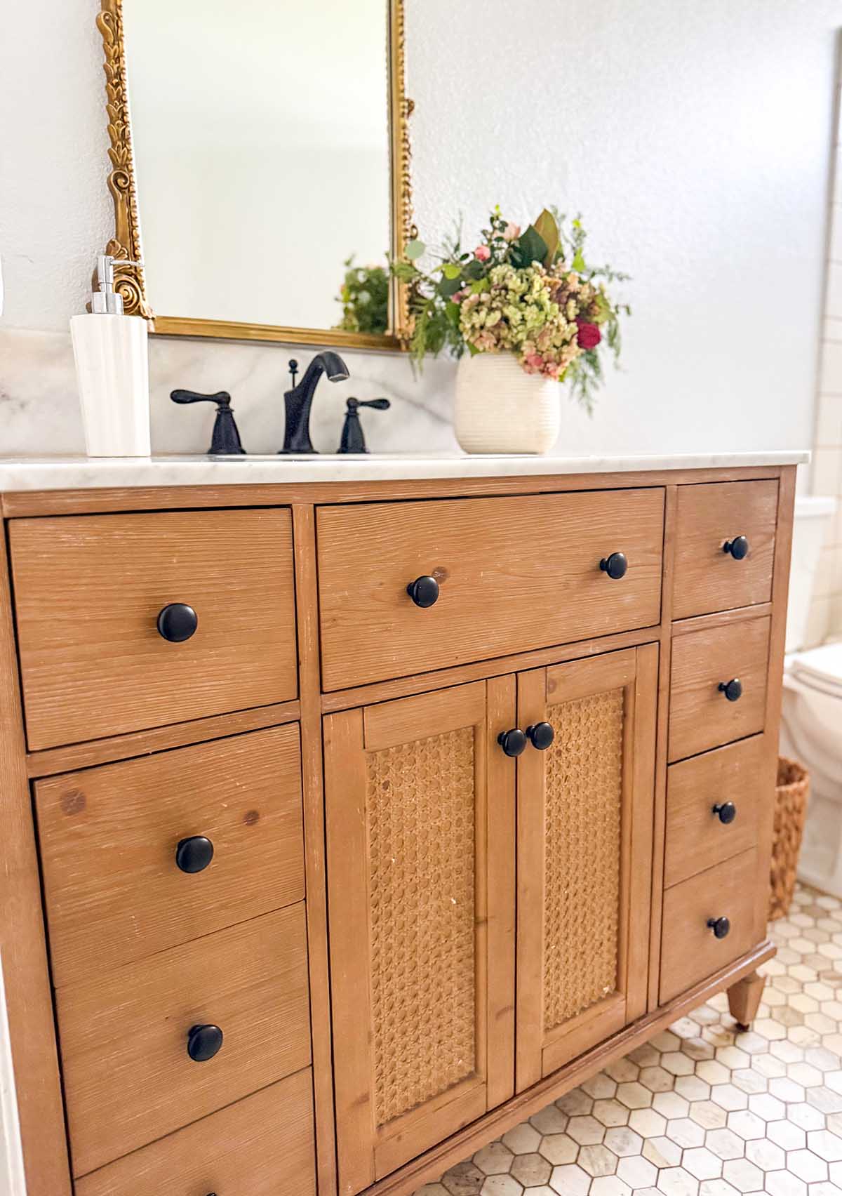 What initially drew me to this vanity was the natural wood finish paired with the cane-detailed cabinet doors. The cane adds texture and character without overpowering the space, and it complements the marble hexagon floor tiles and the rest of the traditional elements in the bathroom. It feels classic, elevated, and livable — the kind of piece that doesn’t feel trendy or dated as time goes on.