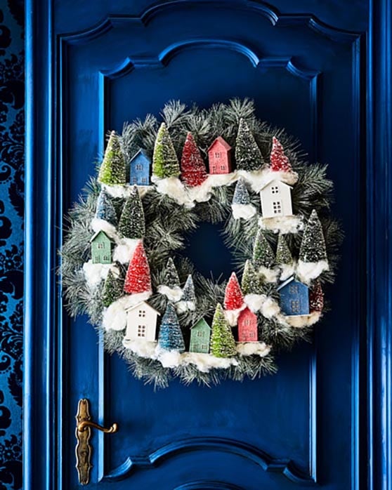 I simply adore this colorful Christmas wreath with houses and bottle brush trees!