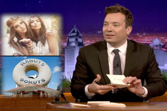 On Friday, February 19, 2016 Jimmy Fallon penned thank you notes to Republican presidential candidate “Donald Trump for constantly getting into feuds, going on Twitter rants and saying you’re the best…you’re basically the white Kanye West.” Jimmy also thanked “Los Angeles for somehow having the most skinny people and the most donut shops”; “The carpool lane for reminding people stuck in traffic that they also don’t have any friends”; “German Shorthaired Pointers for sounding less like a breed of dog and more like a very vague description of Hitler”; “Beverly Hills plastic surgeons for making everyone look 10 years more surprised”; “Hiking in Los Angeles for being a great way to get exercise and find a dead body”; “Thank you, In-N-Out for actually being a more appropriate name for Chipotle.”