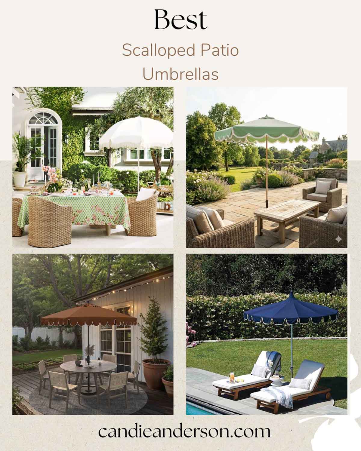 I personally love scalloped patio umbrellas and use them throughout my garden and on my patio, especially when I’m entertaining or styling seasonal tablescapes. They’re one of my favorite ways to make an outdoor setup feel complete without overcomplicating the space. Whether paired with bistro dining chairs, a round outdoor table, or layered with pillows and florals, a scalloped umbrella instantly pulls everything together and creates that effortless, resort-inspired look I’m always drawn to.